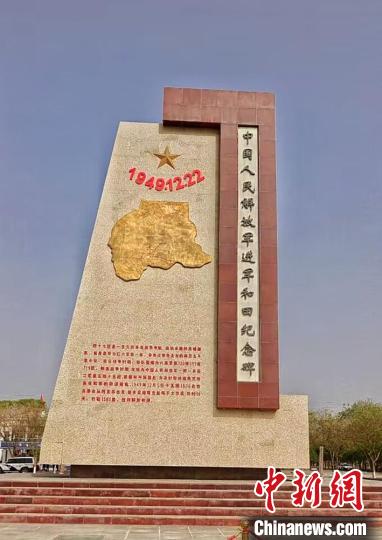矗立在四十七团老兵镇广场上的“中国人民解放军进军和田纪念碑”。 史玉江 摄
