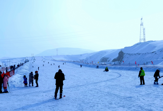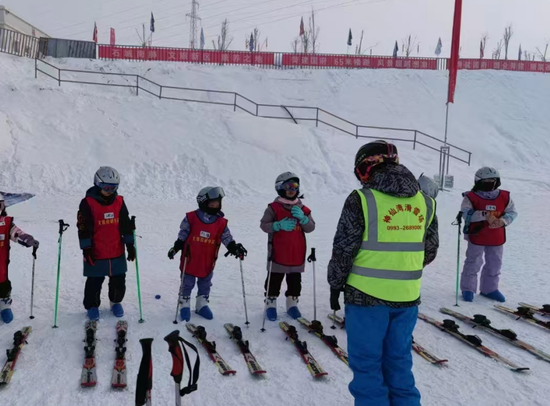 12月10日,在八师一五二团神仙湾滑雪场,小朋友们在教练的指导下学习滑雪技巧。一五二团境内拥有三个滑雪场,它们分别是将军山滑雪场、神仙湾滑雪场、卧龙山滑雪场,三个滑雪场设有初级道、中级道、高级道,可满足不同层级的滑雪爱好者运动需求。(雪峰 朱钰惠)