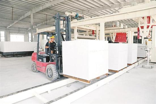 10月10日,工人在位于一师阿拉尔经济技术开发区的新疆巨科商业管理有限公司忙碌生产。9月1日,该企业一期项目正式投产。作为台州援疆指挥部招商落地的台州籍建材企业,新疆巨科商业管理有限公司正逐渐满足一师阿拉尔市相关建筑产业发展的需求。李奔 摄