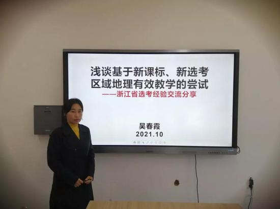 同时她积极发挥“传帮带”的作用,参加第一师高级中学的教研活动。鉴于新疆高中地理新课改、新课标、新教材的实施,吴春霞通过讲座、论坛向受援学校的地理组教师们分享浙江省普通高中地理选考经验。以研促教,分享经验,为落实地理学科核心素养与课堂教学的联系提供参考,为进一步促进教师教学发展指引方向。
