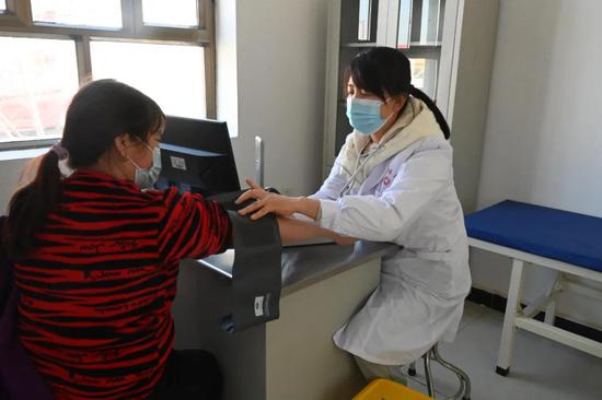 走进卫生室,整洁宽敞的大厅里摆放着座椅及医疗设备,药品柜里常见药品分门别类、摆放有序,连队卫生员耐心地为职工群众进行血压测量。