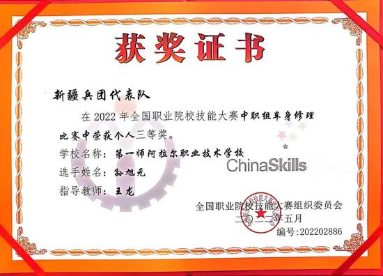 2022全国职业院校技能大赛(中职组)于近日落下帷幕,受援学校新疆生产建设兵团第一师阿拉尔职业技术学校(下称“一师职校”)荣获“车身修理”和“电子电路装调与应用”两个赛项的三等奖。