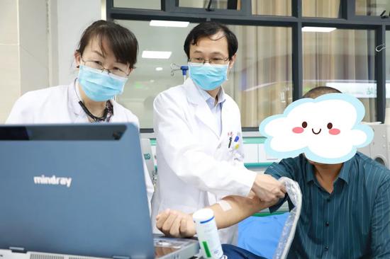 “血管通路是透析患者的‘生命线’,必须保证‘生命通路’通畅,6月7日,我带领肾内科医疗团队开展了一例‘超声引导下经皮腔内血管成形术(pta)’治疗复杂性动静脉内瘘狭窄,在超声定位下,通过导引导丝、扩张球囊给予支撑进行逐层扩张,解决了患者动静脉内瘘狭窄。次日准备查看患者术后情况时,发现另外有患者出现了急性左心衰,心衰也是透析患者的合并症之一,所以我们立即给予抢救。”张晓辉说。