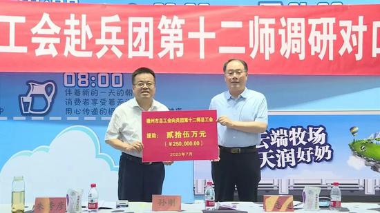 当天,调研组一行参观了天润丝路云端牧场,并召开对口援助工作座谈会,听取师总工会关于德州市工会对口援助项目的实施情况和援疆资金使用管理情况汇报,并为师总工会捐赠25万元援助资金。