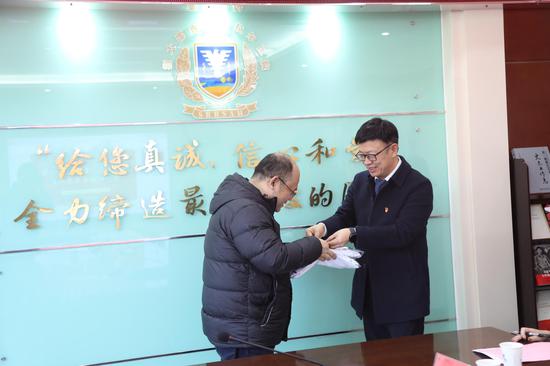 医院党委书记王志强宣读章正祥博士任命书,并向章博士颁授院徽、工作服等物品。