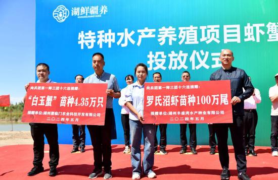 随后,湖州市吴兴区向一师三团捐赠产业发展基金50万元;湖州丰盛湾水产种业有限公司、湖州蟹临门农业科技开发有限公司向一师三团16连捐赠罗氏沼虾虾苗120万尾、“白玉蟹”蟹苗4.35万只。