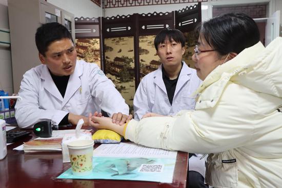 台州“以市包院”援疆专家孙聪(左)与十二团医院中医科主任梁冬浩(右)共同接诊。黄磊 摄
